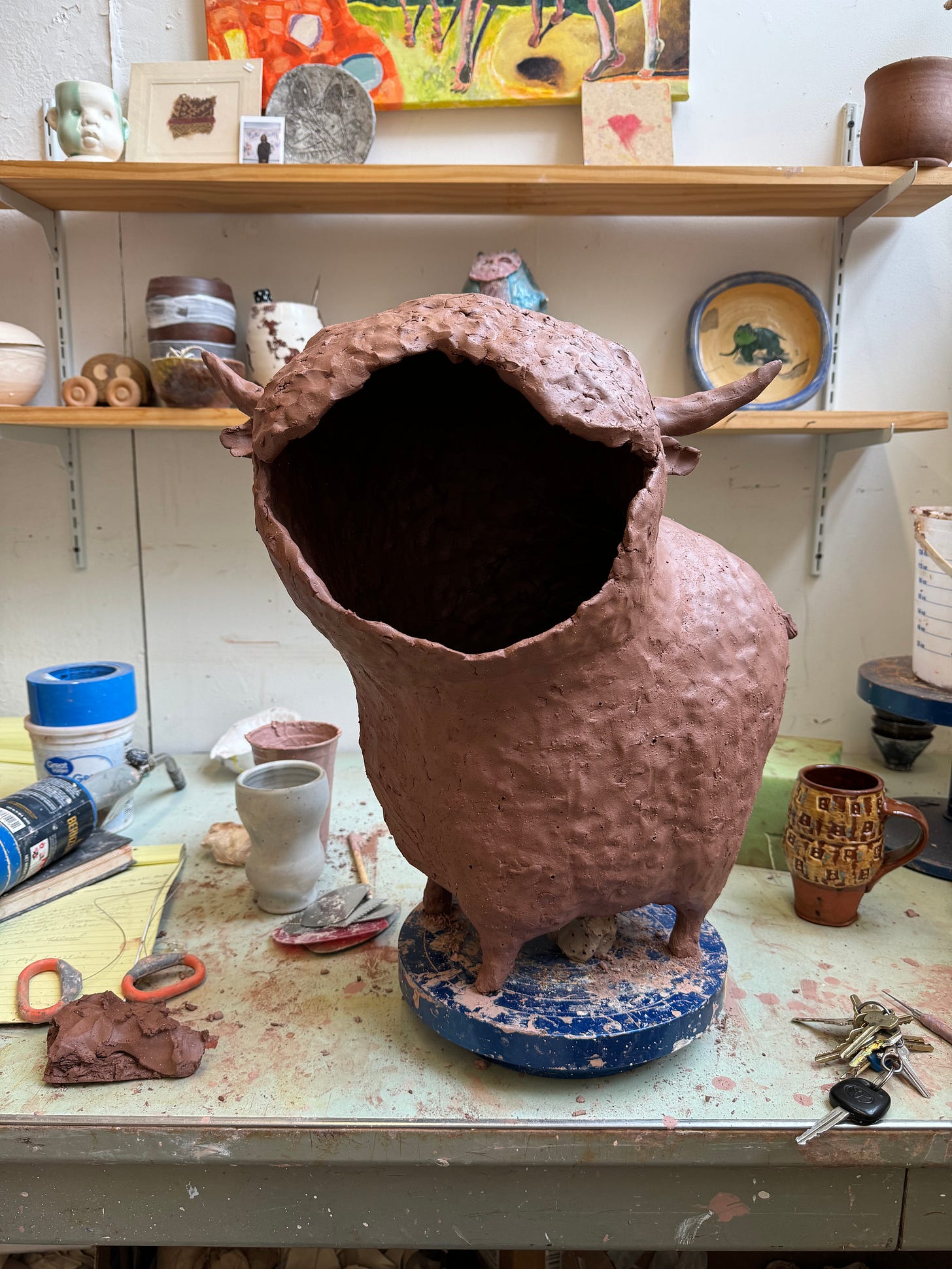 Some of the last work that I will produce in my OU studio…I have only had this studio for one academic year, and my feelings have been complex. While I am certainly ready to move on, this sunlit space helped give birth to my thesis exhibition, and it is a space where I solved so many technical problems in the development of my animal work in clay. Yes, that is a Clary Illian mug on my work table. You can also see a Jason Wang and Tom Bartel if you are playing spot the potter…